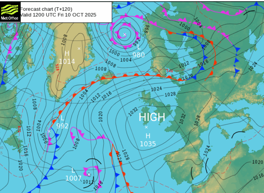 As the high pressure takes hold, the frontal bands are pushed away to the north but it looks like quite a cloudy high. The westerly flow will bring a lot of moisture off the Atlantic and western coasts could see a grey, even damp feeling on Friday. Further east, it will be brighter.