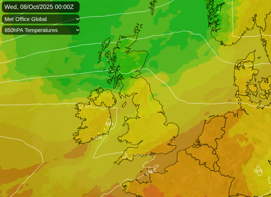 During Wednesday night, another frontal band will dip over central, perhaps southwest Scotland bringing more cloud to Northern Ireland and saving the temperatures from falling away. To the south of this cloud band it will be a cooler night with temperatures down into single figures for England and Wales.