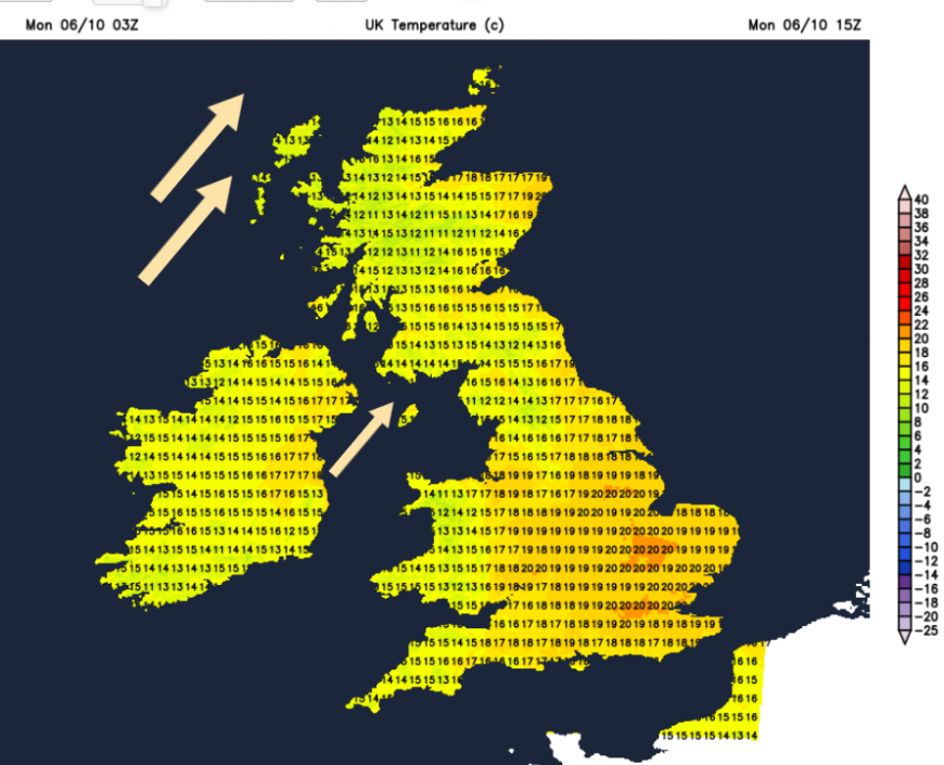 Before that, we have warmer air from the southwest lifting temperatures on Monday. To the lee of the Grampian mountains, Northeast Scotland could see 21 or 22C today. Central, eastern and southeastern England should see 18 to 20C with much lighter winds and sunshine. Areas exposed to brisk SW winds won’t feel as mild. NW Scotland will turn increasingly wet and windy for a time this afternoon as a waving front nears with gales.