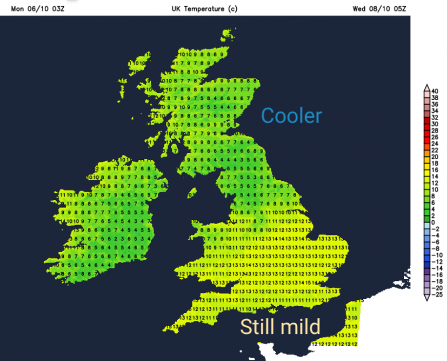 Through this week, it will always be windy or blustery in the north with lighter winds further south. Northwest then western Scotland will see rain. Other areas will have a lot of dry weather this week. As autumn progresses, it can feel pleasantly warm in sheltered sunshine but chilly in the breeze, when the sun disappears. The change from the warm air to the midweek cooler air is worth noting. And later in the week, there is likely to be fog patches overnight where skies clear but it is tricky to pinpoint where with this cloudy high building in.