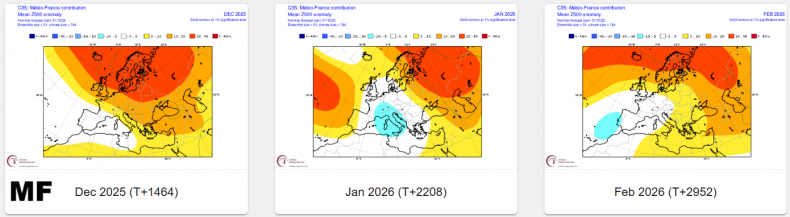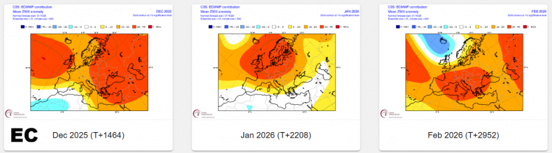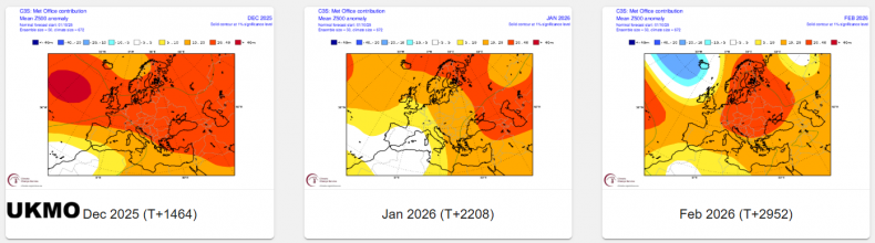 Some, but not all, of the seasonal models are indicating higher than average heights over northern Europe or higher latitudes towards polar regions in December and January - which indicates a greater chance of a -NAO with blocking episodes both months, which may bring a greater chance of colder weather. February, the seasonal models generally suggest, though not all, a stormier and milder +NAO pattern.