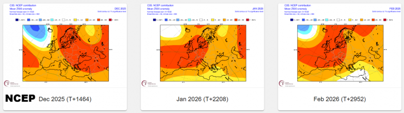 This is reflected in most of the 500 hPa mean anomaly forecasts for December and January - which signal a higher-than-average chance for high latitude positive height anomalies with a negative North Atlantic Oscillation (-NAO). The exception is the American NCEP (CFS) model, which has a +NAO pattern for all 3 winter months. February signalled by ECMWF, UKMO and NCEP (CFS) to have lower heights to the northwest over the far North Atlantic and higher heights over mainland Europe - typical of a +NAO pattern.