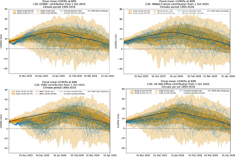 The CS3 seasonal forecasts were updated on 10th of October and most show, to varying degrees, a weaker-than-average polar vortex over the Arctic during early winter, particularly DWD and UKMO, less so ECMWF.