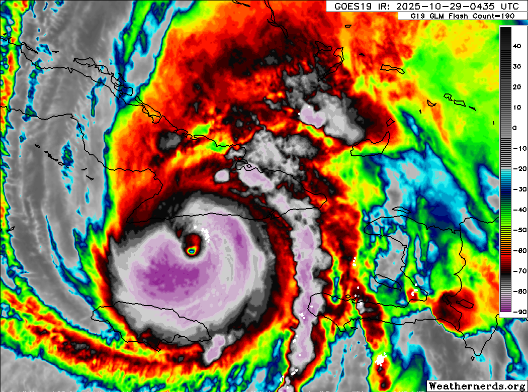 Melissa weakened after landfall across Jamaica as its slow track across land took away its fuel source of the warm ocean, with the eye collapsing. However, it reorganised again as left Jamaica’s north coast and moved out over open water, the storm restrengthening as it approached eastern Cuba, category 4 for a time with 130mph winds, then making a 2nd landfall over the southern coast of eastern Cuba near Chivirico at around 3am local time as a category 3 hurricane with 120mph max sustained winds.