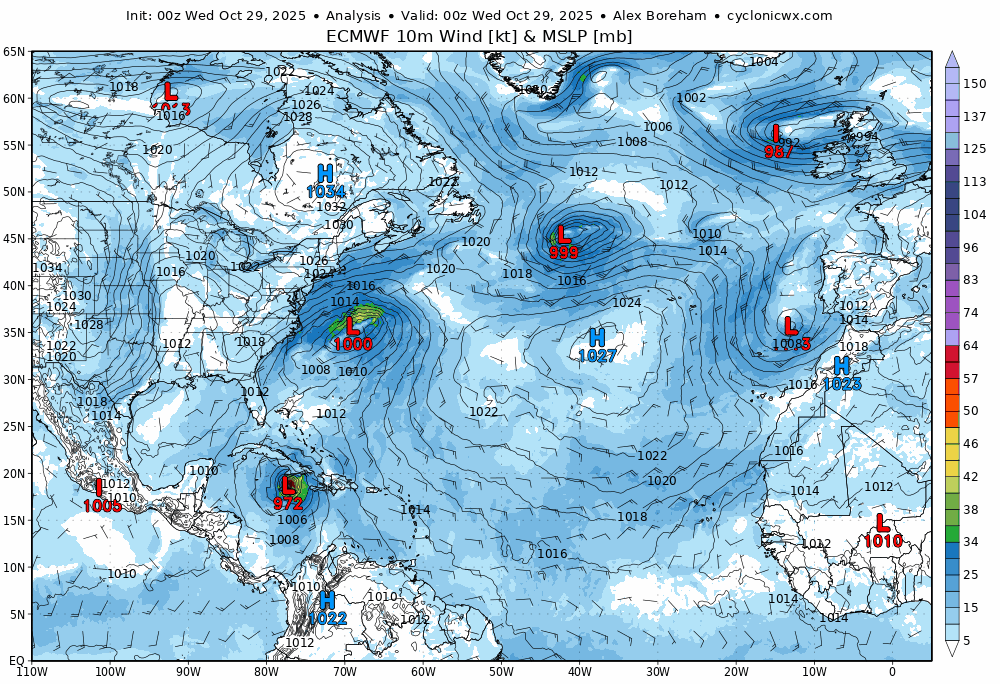 Melissa will continue northeast inland over Cuba, fortunately at a quicker speed than over Jamaica, and perhaps weakening somewhat, but still a powerful major hurricane with 115mph max sustained winds and heavy rainfall bringing the threat of life-threatening flash-floods.  After crossing eastern Cuba this morning, Melissa is expected to continue accelerating northeastward over portions of the southeastern and central Bahamas this afternoon. Then, the models consensus is for the centre of Melissa to pass to the west of Bermuda late Thursday and into Friday.