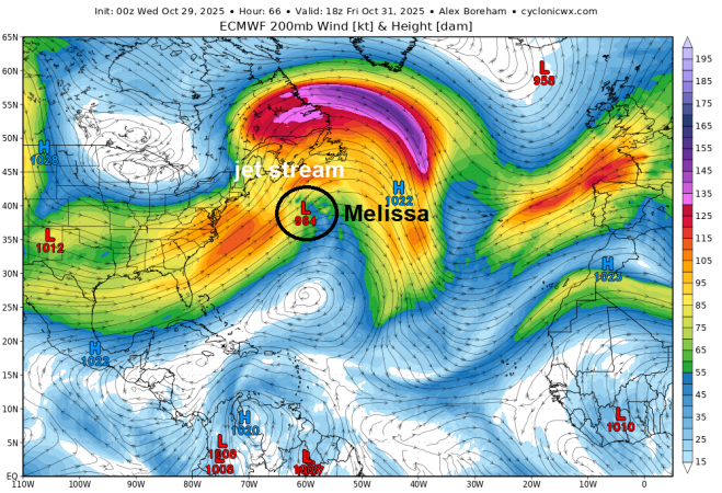 From then on, Melissa continues northeast over the open NW Atlantic, eventually losing tropical characteristics Friday night or early Saturday, becoming an extratropical cyclone southeast of Nova Scotia, eastern Canada. Around here, it will be picked up by a fast jet stream coming out of North America and out over the NW Atlantic and the extratropical cyclone containing the remnants of Melissa then carried northeast towards the NE Atlantic between Scotland and Iceland into early next week. Though models diverge on the track and depth of cyclone / low as it approaches the NE Atlantic.