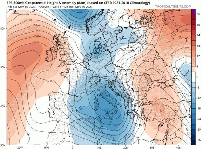The reason for the recent and current very unsettled spell of weather over the central Mediterranean is an upper low that has become stuck and slow-moving over central and southern Europe between a blocking upper level high over the NE Atlantic and blocking upper high over eastern Europe and western Russia. The upper low looks to drift southwest towards southern Spain and Morocco over the weekend, but as it pulls away it will pull warm moist and unstable air north into Italy – bringing more heavy rain, but focussed over NW Italy this time.