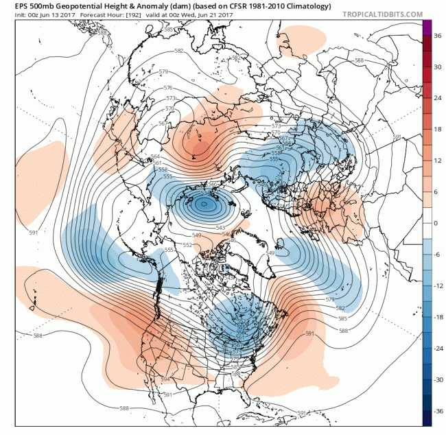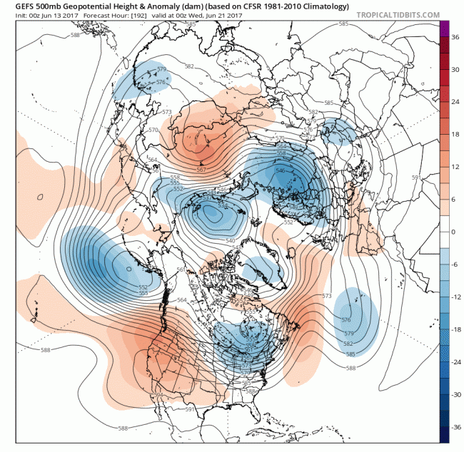 00z GFS/GEFS mean 500mb height and anomaly for 00z Weds 21 June