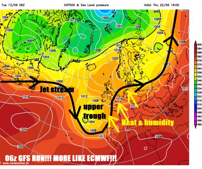 The European ECMWF weather model, regarded at the best verifier in the medium range, shows a long-wave upper trough digging southeast across the North Atlantic next week on the 00z deterministic/high res run, becoming quite amplified in southern extent toward Maderia as it moves across the eastern N Atlantic. This allows a plume of hot air building over Iberia and SW France this weekend and early next week to spread north across the UK later in the week.