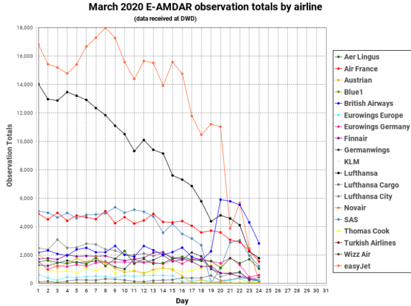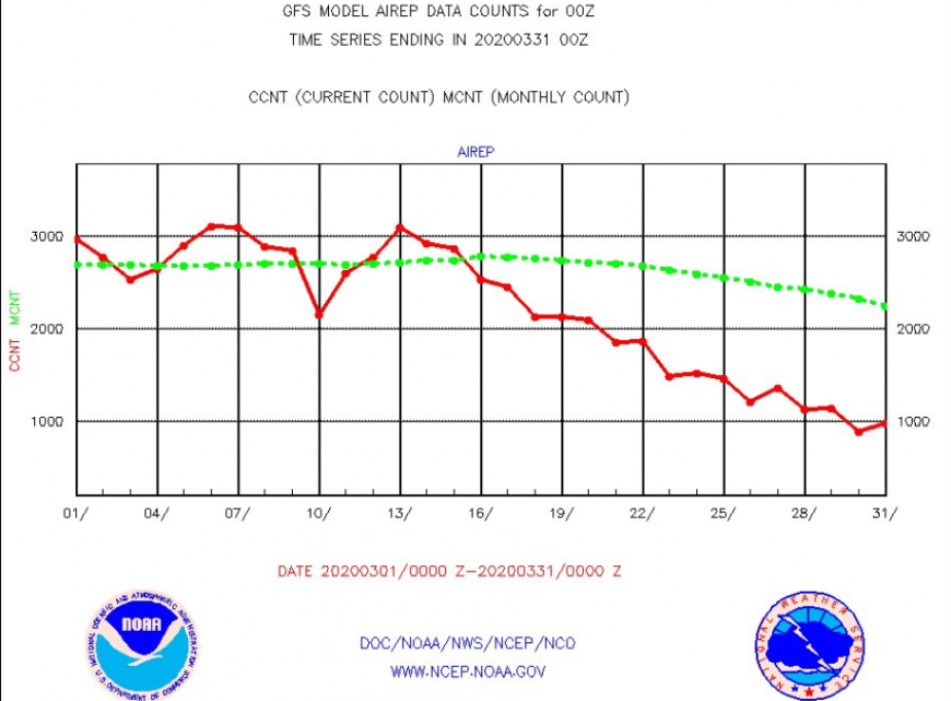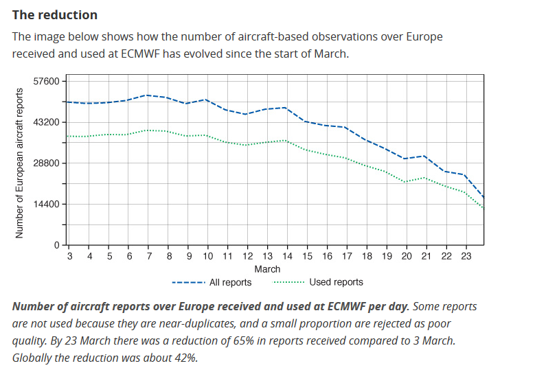 From ECMWF “ the number of aircraft observations has gone down significantly over the last couple of weeks both over Europe and globally. In the coming days and weeks, we expect a further decrease in numbers, which will have some impact on forecast quality in the short-range, particularly around the polar jet stream level (10–12 km altitude)."
