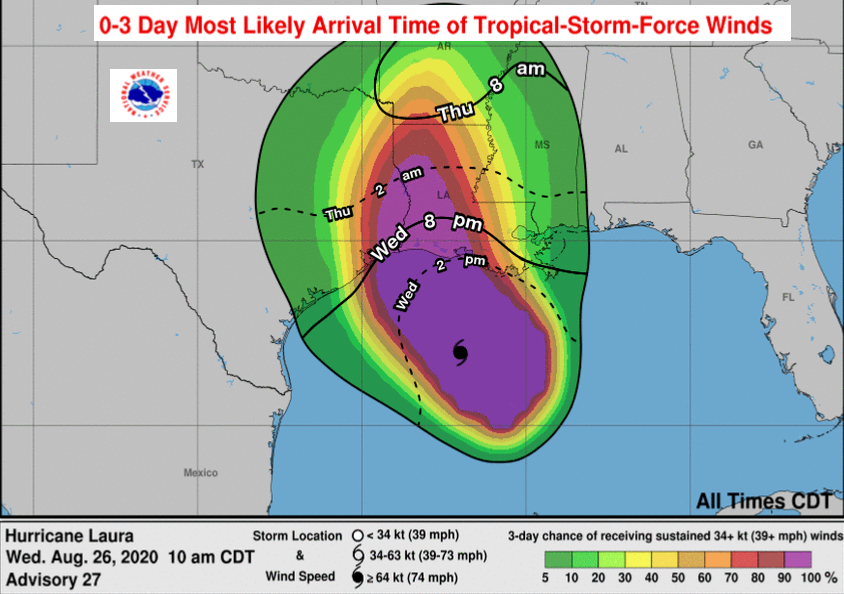 “Unsurvivable storm surge with large and destructive waves will cause catastrophic damage from Sea Rim State Park, Texas, to Intracoastal City, Louisiana” NHC. “Hurricane-force winds are expected tonight in portions of the hurricane warning area with catastrophic wind damage expected where Laura's eyewall makes landfall.”