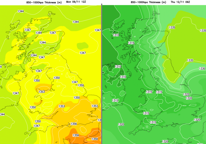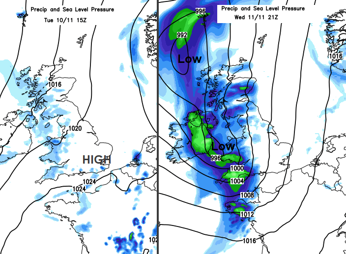 Daytime temperatures would usually be between 7 to 11C on average in November. With mid-teens continuing this week it is mild, even very mild for the time of year. This unusual southerly flow keeps bringing the mild, moist air our way until a cold front forces its way over Britain on Wednesday night.