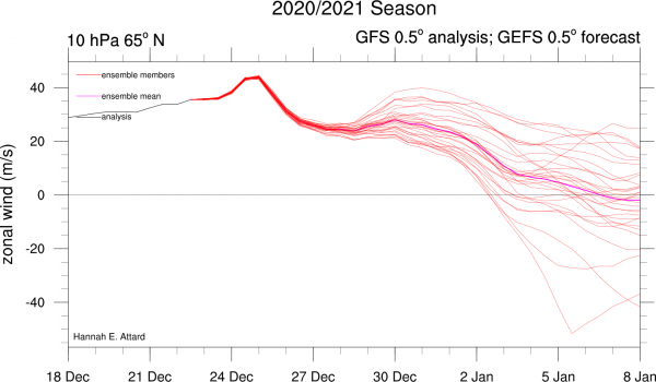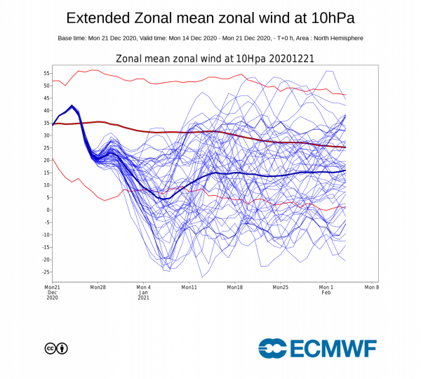 GFS operational runs and increasing GFS ensemble members have been going for a reversal of zonal winds at 10 hPa (65’N) for the past week, with the latest extend EC zonal mean zonal winds at 10 hPa also jumping on board with a reversal. The GloSea5 daily run yesterday also bringing a SSW in early January.