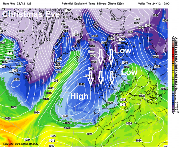 A change in weather pattern is underway that will usher in colder conditions for Christmas Eve and into Christmas Day. What’s happening is a southwesterly jet stream running across southern UK over the last few days, bringing mild and wet weather across southern Britain, with flooding issues in the west midweek, will be replaced by a northerly jet stream as the jet stream buckles upstream over the Atlantic. This will help pull down a cold northerly flow from the Arctic at the surface for Christmas Eve, which will be a mostly cold, dry and sunny day.