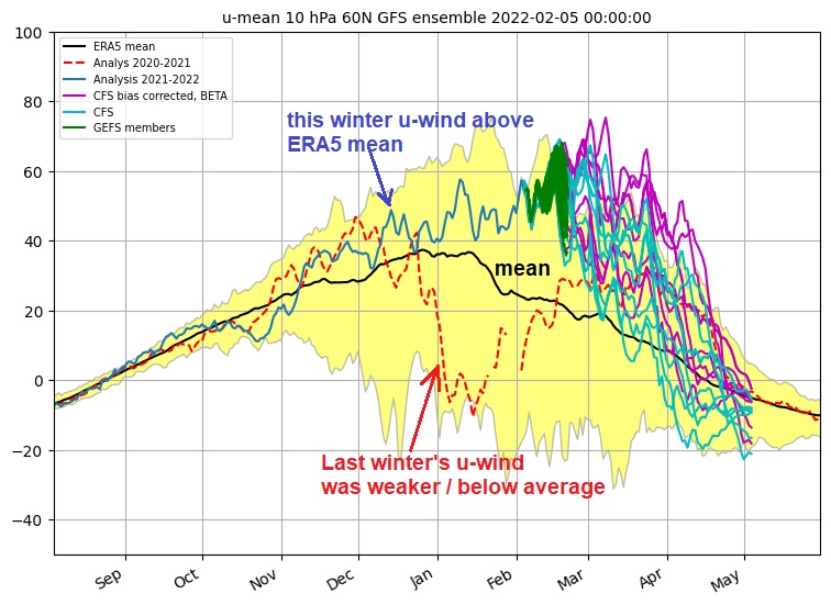 The zonal mean zonal wind at 10 hPa 60N is today (GFS analysis): 54.8 m/s