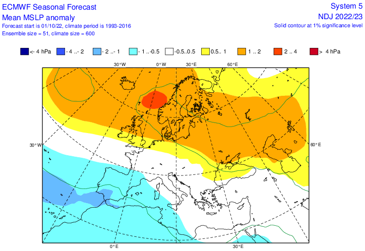 Putting all three months of November, December and January together for the ECMWF seasonal mean seal level pressure and we get this look of high latitude blocking and lower pressure towards SW Europe.