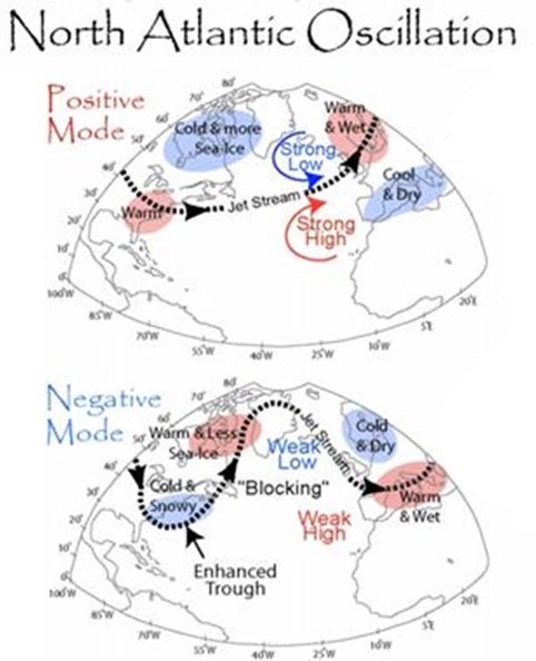 When the AO (Arctic Oscillation) is strongly negative, a weaker, meandering jet dips farther south, allowing Arctic air to spill into the mid-latitudes, including Europe and USA. -AO features higher-than-average air pressure over the Arctic region and lower-than-average pressure over the North Pacific and North Atlantic Ocean. The jet stream shifts south in track over the North Atlantic, so larger parts of Europe, including the UK and Ireland, are more likely to experience outbreaks of cold, polar air during winter.
