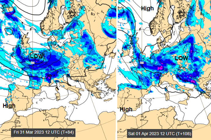 A vigorous low pressure is forecast to move across southern Britain during Thursday night bringing strong winds and a spell of heavy rain. It is linked to a strong zonal jet powering its way straight across the Atlantic. That low pressure then crashes into the Low Countries with blustery showers and longer spells of rain for Saturday which extend over Germany and France, even down to the Alps. That means more fresh snow for the higher slopes. A dig of colder air will pull down through Scandinavia with snow for Denmark at the weekend