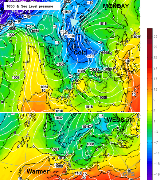 There will also be snow for the Pyrenees and wet weather along the north coast of Spain in a cooler north-westerly flow. Santander will have a wet weekend with cool blustery conditions at the ferry port. Barcelona remains sheltered and sunny with temperatures into the low 20sC. The jet will buckle and become more meridional with low pressure trapped and less mobile within the loop over central, then southern Europe.