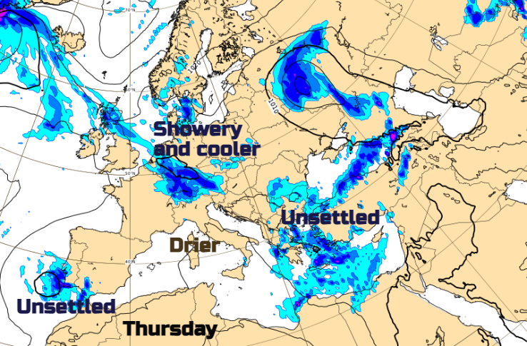 High pressure takes hold over the UK and western mainland Europe but that same low refuses to give up. It churns away with clusters of showers for the Adriatic, Italy also the Greek Islands by Tuesday and Crete. The heavy thundery showers and unsettled conditions shift across to Turkey and around the Black Sea by the middle of next week.