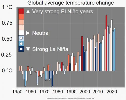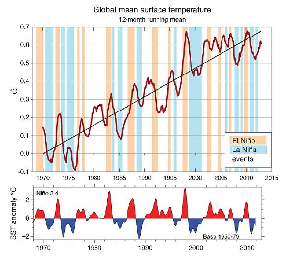 El Nino events have normally coincided with higher global temperatures, while La Nina has meant lower global temperatures, though in recent years the global temperatures have been steadily rising regardless of ENSO state. But El Nino may still bring higher temperatures than in La Nina in a generally higher base state.
