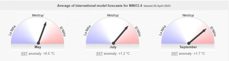 After three years of the La Niña weather pattern, Australia's Bureau of Meteorology (BOM) analysis suggests that sea surface temperatures will cross the El Niño threshold this summer (southern hemisphere winter as stated in tweet below):