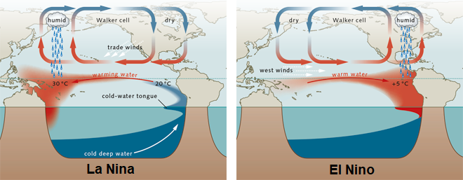 El Niño is a warming of the ocean surface that brings above-average sea surface temperatures (SSTs) in the central and eastern tropical Pacific Ocean. Over Indonesia, rainfall tends to become reduced while rainfall increases over the tropical Pacific Ocean. The low-level surface winds, which normally blow from east to west along the equator instead weaken or, in some cases, start blowing the other direction (from west to east). During La Nina, the opposite happens and the central and eastern tropical Pacific undergoes a marked cooling.