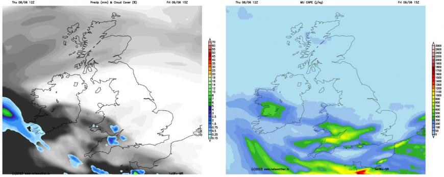The plume of warm and humid air will start to encroach aloft across the far SW of England and Channel Islands this evening and overnight, with an occluded front bringing a band of outbreaks of locally heavy and thundery rain across NW France pushing north across Cornwall and perhaps Devon tonight. Some modest destabilisation in the mid-levels may bring an isolated thunderstorm or two northwestwards amongst the showery bursts of rain tonight into early Friday, before these thundery showers tend to ease through Friday morning. Then further showers, perhaps thundery, returning from the southeast across SW England during Friday evening and night, perhaps affecting SW Wales and southern Ireland too.