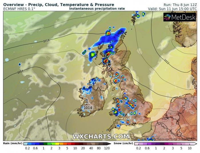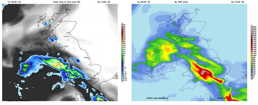 Vertical shear is forecast weak - so no organised severe weather is anticipated, but where they do pass over, given quite high amounts of MUCAPE (Most Unstable Convective Available Potential Energy) forecast – there is a risk of hail, frequent lightning, intense rainfall (30-40mm in an hour) and gusty winds. With ground widely dry and hard from weeks of no rain, intense rainfall will likely mostly run straight off rather than soak into the ground – which increases the risk of flooding – given potential rainfall totals. Where it stays dry and sunny, temperatures are forecast to reach the high 20s or even low 30s degress Celsius across England.