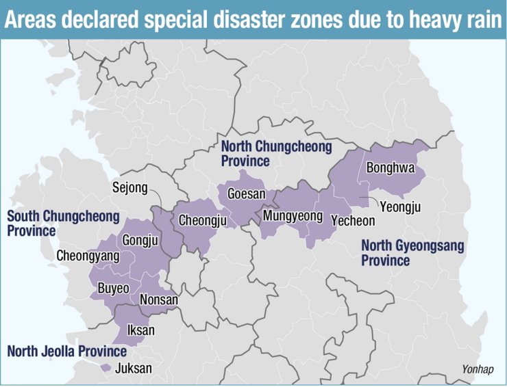 The Korean Meteorological Administration (KMA) said that up to the 15th July, there had been around 30 to 40% more rainfall than average in the central and southern regions. Around 470 to 490mm of rain fell in under three weeks, which is considerably more than average for the entire monsoon season. There has been extensive crop damage including to rice fields and orchards. Also, thousands of livestock have drowned in the flooding with damage to significant cultural monuments across the country.
