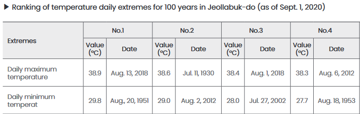 A few of the more recent rainfall extremes from KMA, over the psat 100 years in Jeollabuk-do (as of Sept. 1, 2020).