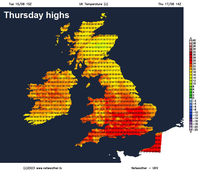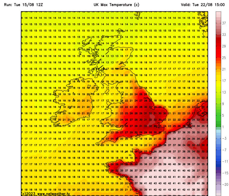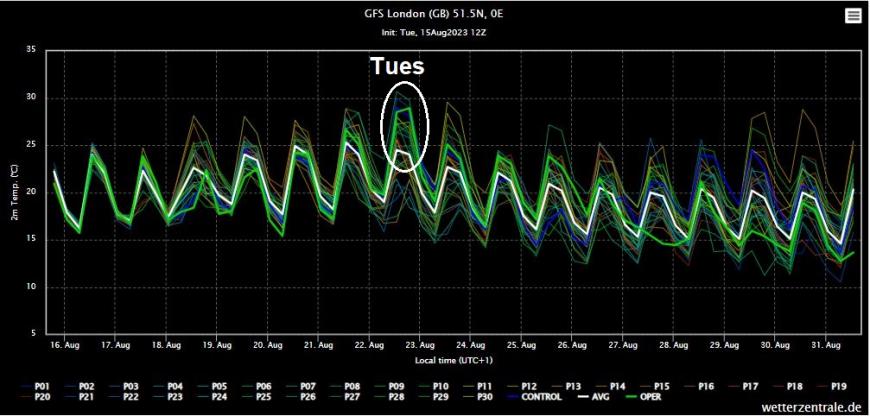 Next Tuesday is still far enough away for there to be some uncertainty over it getting as hot as low 30s, after all, it looked like this Friday could see 30C, but temperatures, although still possibly reaching the high 20s, may be just shy of 30C. A look at the ensembles shows that the 12z GFS operational run was at the warm end of the ensemble spread, while 00z EC ensembles mean only touches 25C next Tuesday, the deterministic lower, though some members do reach 30C. So it remains to be seen if it will get as hot as GFS paints, but certainly a possibility.