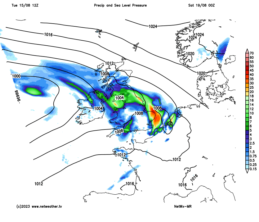 Following the second area of thundery rain clearing northeast Friday night will be slightly cooler and fresher air off the Atlantic for the weekend, but with pressure rising from the south and the flow from the southwest, it should be mostly dry away from the west, where we may see a few showers, and it looks to remain pleasantly warm in the sunny spells both Saturday and Sunday. Which makes a change from the last 5 weekends – which have been unsettled.