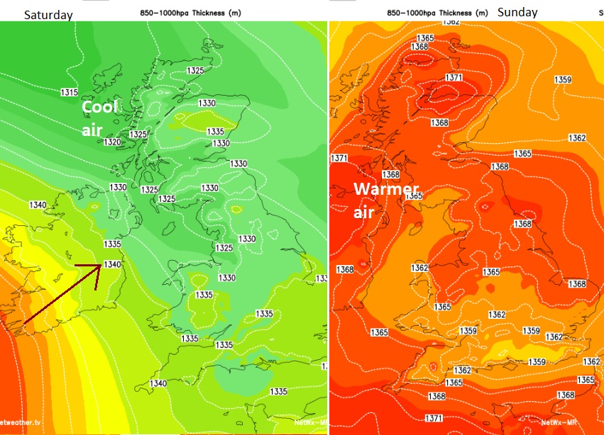 A weekend of two halves is coming up. Saturday looks fine, cool yet calm. Sunday will be blustery, milder and some parts of the UK will get very wet.