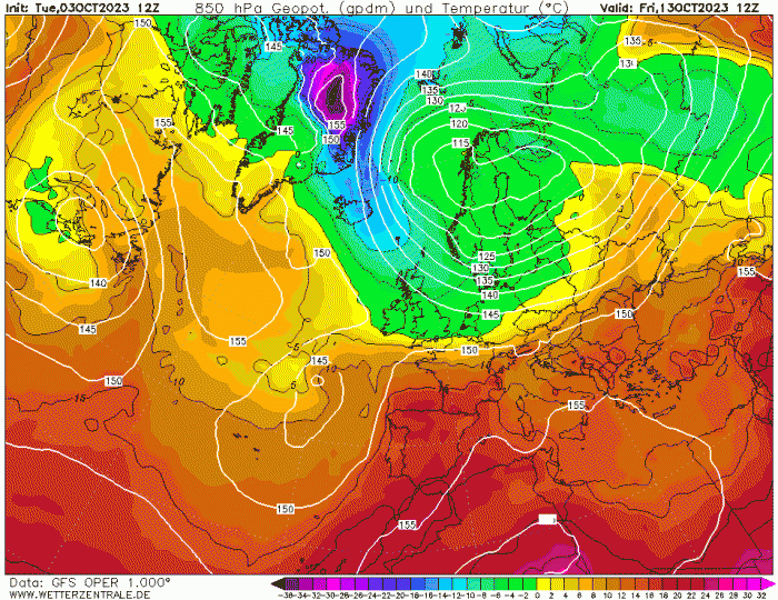 The warm spell on the way this weekend for southern Britain, comes courtesy of hot air pushed north by a strong ridge of high pressure over Iberia and France later this week which builds further north across Britain. Some unusually high temperatures for early October across Iberia later this week and Saturday, GFS showing temperatures reaching the mid-30s Celsius across southern Portugal and SW Spain, as high as 37C in the Seville area. The average max for October in Seville is 27C. SW France reaching the low 30s Celsius too.
