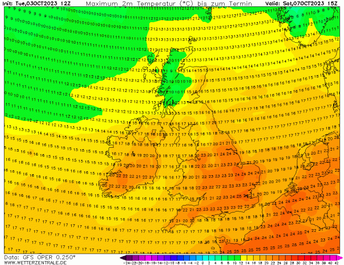October continues the warmer than average trend that September finished with. This coming weekend could see temperatures reach 24-26C across SE England and East Anglia and generally reaching the low 20s Celsius across large parts of England and east Wales too.