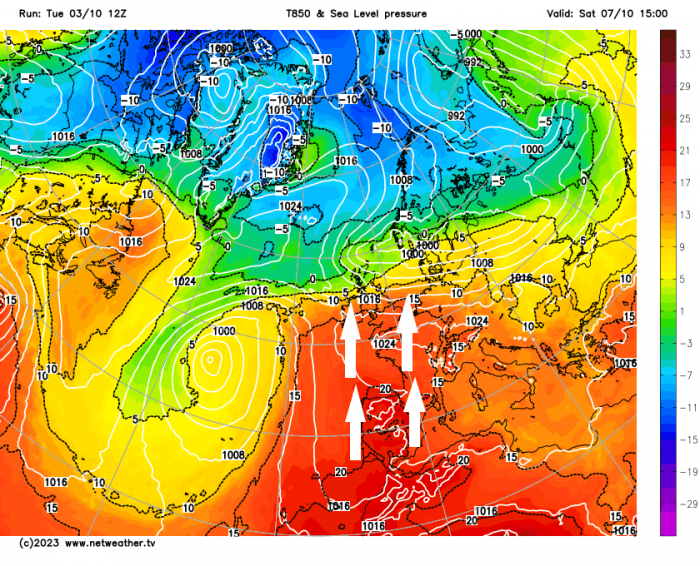 The warmth continuing into next week too, with low 20s Celsius towards the southeast. But later next week, both 12z GFS and ECMWF show something much cooler with the flow turning northerly on Thursday. But it’s over a week away, so may change.