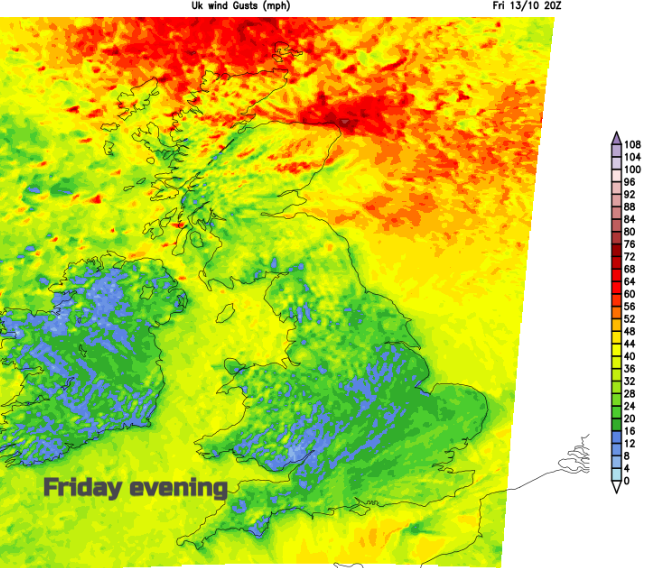 This cold northwest wind will drive in showers for northern and NW Scotland, to Northern Ireland and later in the night, they will reach north Wales and the Isle of Man. By Saturday morning there will be a scattering of rain showers reaching Liverpool and areas around the North Sea, pushing through the Cheshire Gap and into more of Wales as the showers over Highland Scotland turn to wet snow.