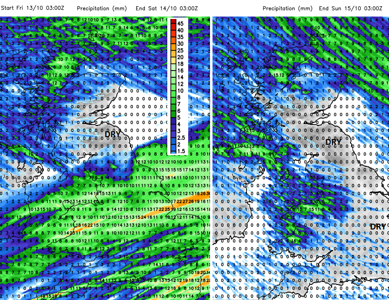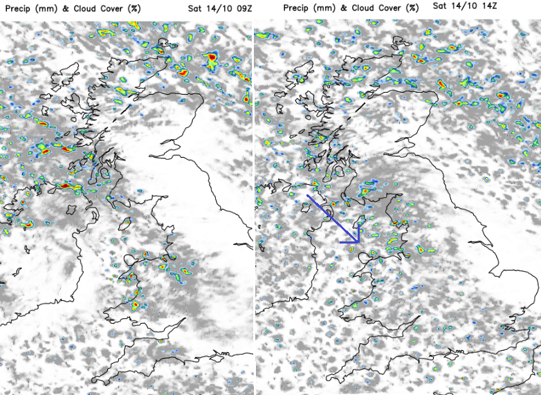 Rain affected areas today, frontal rain over Wales, Midlands and Lincolnshire, with showery rain to southeast, heavy showers in far NW. Drier for most tomorrow although with a scattering of showers for western parts.