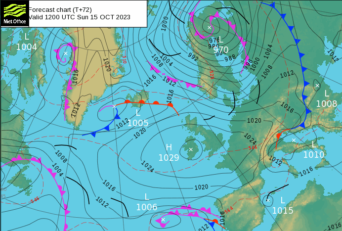 For England and Wales, there is more rain today but it will clear away to the southeast for the main part of the weekend. In its place, there will be chill from the north, a plunge of Arctic air steered by a deepening low pressure which is moving from the Faeroe Islands to Lapland. There will be snow showers for northern Scotland on Saturday and Saturday night.
