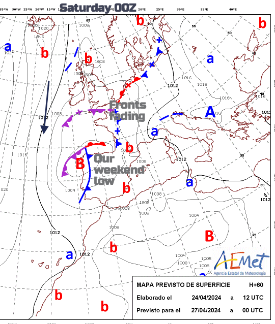 Initial weak low b by Cornwall followed by major Low B, which is heading for northern Spain.