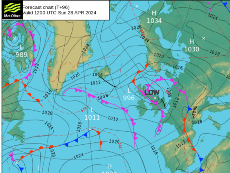 During Saturday night, the main weekend, low pressure will appear over northern France. The northeasterly to northerly winds will pick up for central and southwestern England and Wales. As the frontal rain hits the cold air, there will be sleet and hill snow. Where it reaches depends on how far north and west it reaches. Possibly over the Pennines, maybe the Cheviots by Sunday morning