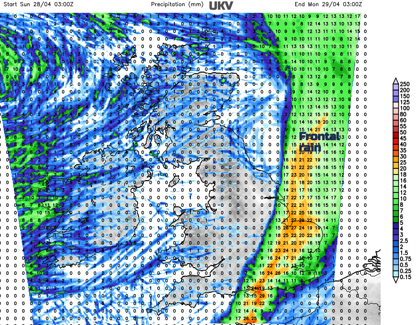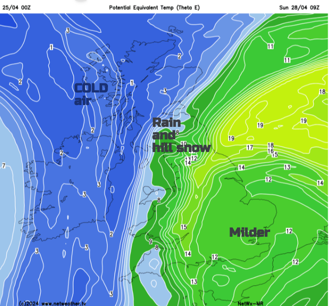 Ahead of all this for NW UK, it will be calmer. It will still be chilly but fair. Under the frontal band, it will feel cold, especially in the wind with rain and further hill snow. The main area of rain will rotate northwards but there is some uncertainty around how much of Britain will be affected by the rain. The ECM model keeps the heaviest rain east of the Humber and barely brushes Aberdeen by Sunday evening on its way to the Northern Isles. Showers will trouble western counties in this scenario, but many parts of the country will see a fair day.
