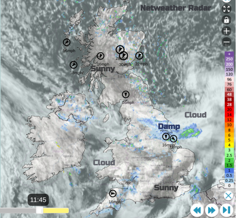 There has been some rain, but it has mostly been light. On Thursday, a small low pressure swept down the North Sea. This has brought a bit more rain to northeast England, and there is a cool, unstable showery flow following to the north, with even a bit of snow for the highest routes of inland Scotland today and the North Yorkshire Moors. Further south, it's still quiet but mixed, with some parts seeing clear blue skies and sunshine but others cloaked in low cloud.