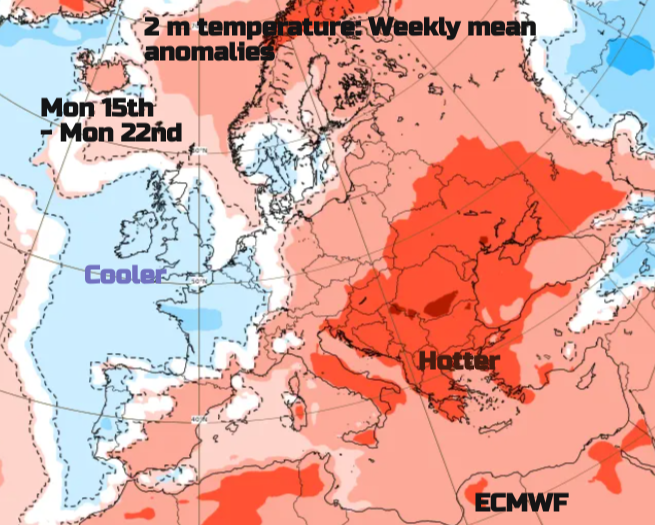 The next week looks similar with the heat staying in the south and southeast of Europe. Perhaps some disruption nearer the end of July for the Balkans, the Adriatic up to Austria with temperatures coming down. Spain and Portugal and the western Mediterranean look hot, could that heat finally push northwards towards the UK, or is holidaying abroad the only answer for sun seekers this summer?
