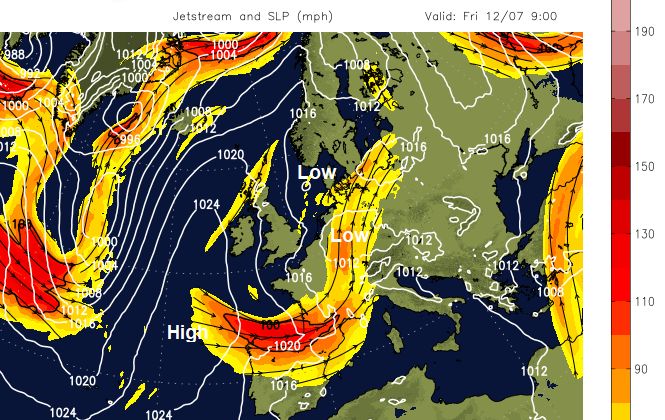 On Friday a low pressure will continue to work its way eastwards from France over Germany into Poland and the Alps. This has thrown early showery rain over SE England and the English Channel on Friday morning and will combine with a lingering North Sea low pressure to influence the weather over eastern Britain this weekend.