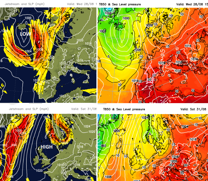 What changes is the direction of the flow. We lose this very warm continental air and once the cold front moves towards the North Sea, a more westerly flow takes hold with cooler, fresher air from the North Atlantic during Thursday and Friday . The nights will feel cooler in the north of the UK. The jetstream loop moves towards Norway and high pressure begins to build for Friday evening. That high pressure soon slips towards Scandinavia.