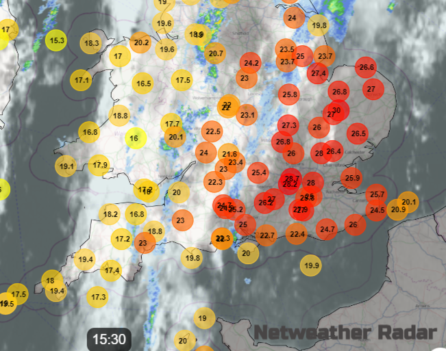 There will be a change from the midweek setup. Currently, high pressure over northern mainland Europe is helping direct the very warm southerly flow from north Africa, through Spain and France towards the UK. A large loop in the jetstream is aiding surface blustery winds with a low pressure near Iceland. This brisk wind is helping dry out the air as it rushes over the mountains and hills of Britain. Although there are weather fronts with more cloud and outbreaks of rain strewn across the UK, the southeast has seen a good deal of sunshine to help heat the ground in the very warm air.