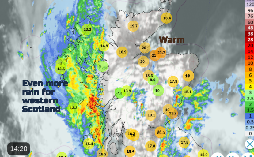 Cambridge reached 26.7C on Tuesday with the peak of this week’s warmth or heat expected on Wednesday. Sunday might become very warm again in the south but there is some uncertainty here. Eastern and northeastern Scotland have been enjoying temperatures over 20 Celsius on Wednesday even if the schools have been back for a while. Greater London is expected to pass 28C today with much of southeast England and East Anglia in the mid-20s Celsius. It’s not intense heat, not into the 30s Celsius that we can see in the UK but still, it’s a very warm spell with sunshine. And lighter winds for central and western areas will make a difference.