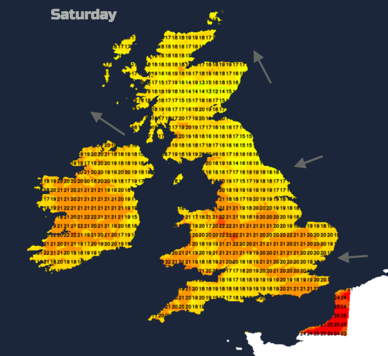 During Saturday, these well scattered clusters might drift westwards over southern Britain during the day with plenty of medium-level cloud. For much of the UK, there will be a lot of fair, dry and bright weather with just pockets of stubborn low cloud. In the sunny or bright areas, it will feel pleasantly warm. The east coast will feel fresher with a breeze off the North Sea. Pembrokeshire will feel warmer, up to 21C.